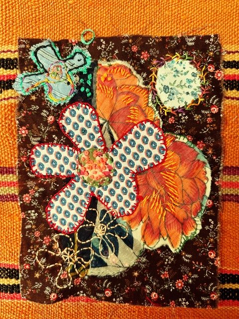 Explore making fun, floral, fabric collages embellished with embroidery and hand stitching. These little gems can be turned into wall hangings and pillow embellishments, used as part of a quilt or in a visible mending project. You could embellish a cloth tote or decorate your denim jacket with one. We will focus on color and design using basic stitches and appliqué.