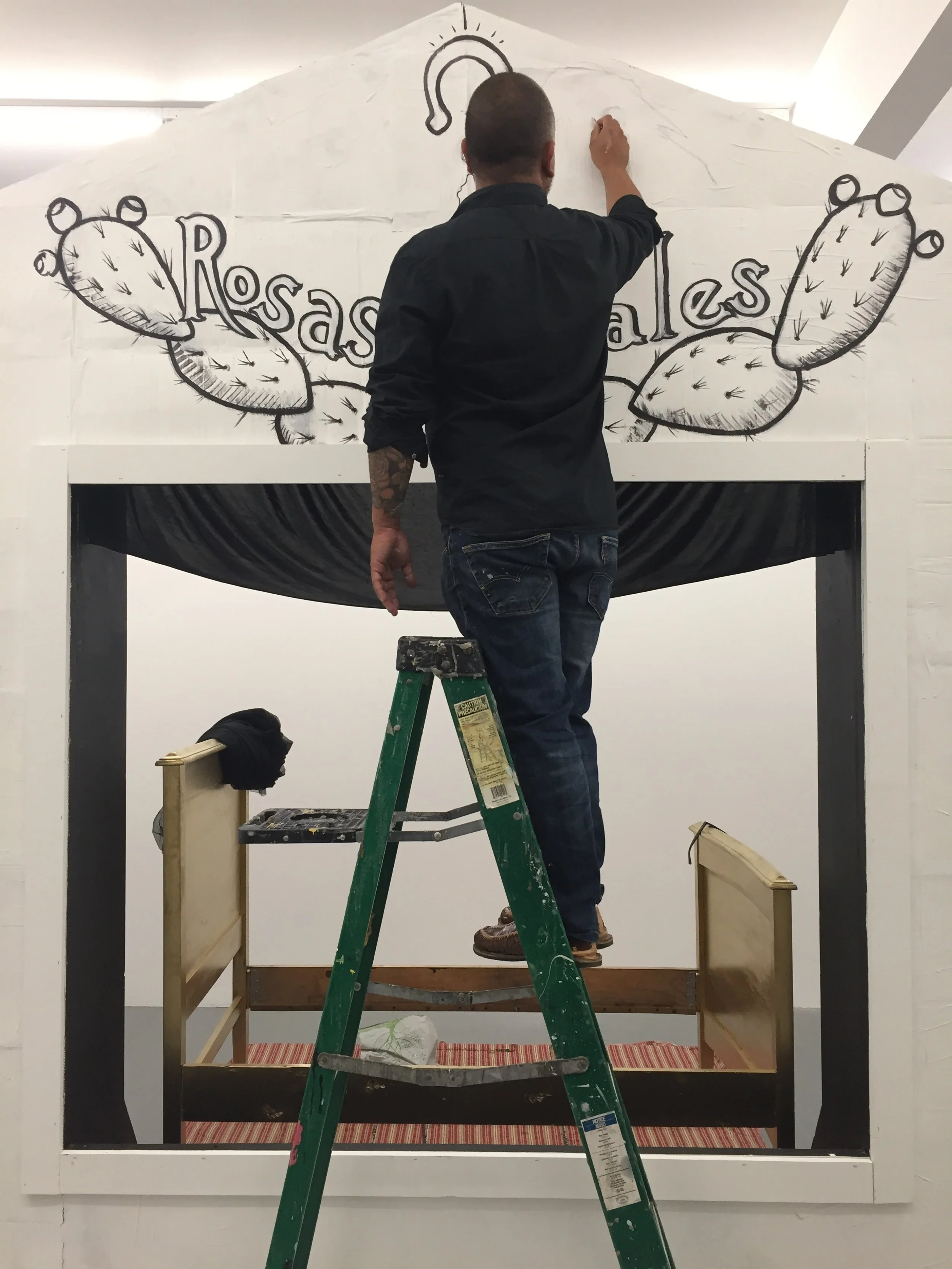 On the Blue Line is a site-specific installation created by artist Armando de la Torre. Using found objects, photography, and recycled cardboard and wood, de la Torre incorporates sound and video to explore common threads between his community of Barrio Logan, the gallery space, and his own life. "For forty years the Blue Line trolley has been the heart line for many commuting to school or work from the San Ysidro/Tijuana station to the Downtown station. Recently it was extended to UCSD/La Jolla, promising to connect people with opportunities for jobs, education, and healthcare," he describes. The Barrio Logan Blue Line station is walking distance from the Athenaeum Art Center. "The Blue Line is a framing device and a metaphor for people on a journey to a better place and I simply want to show that anyone can express themselves and tell a story using common materials available to everyone. It's a simple act that can be very empowering."