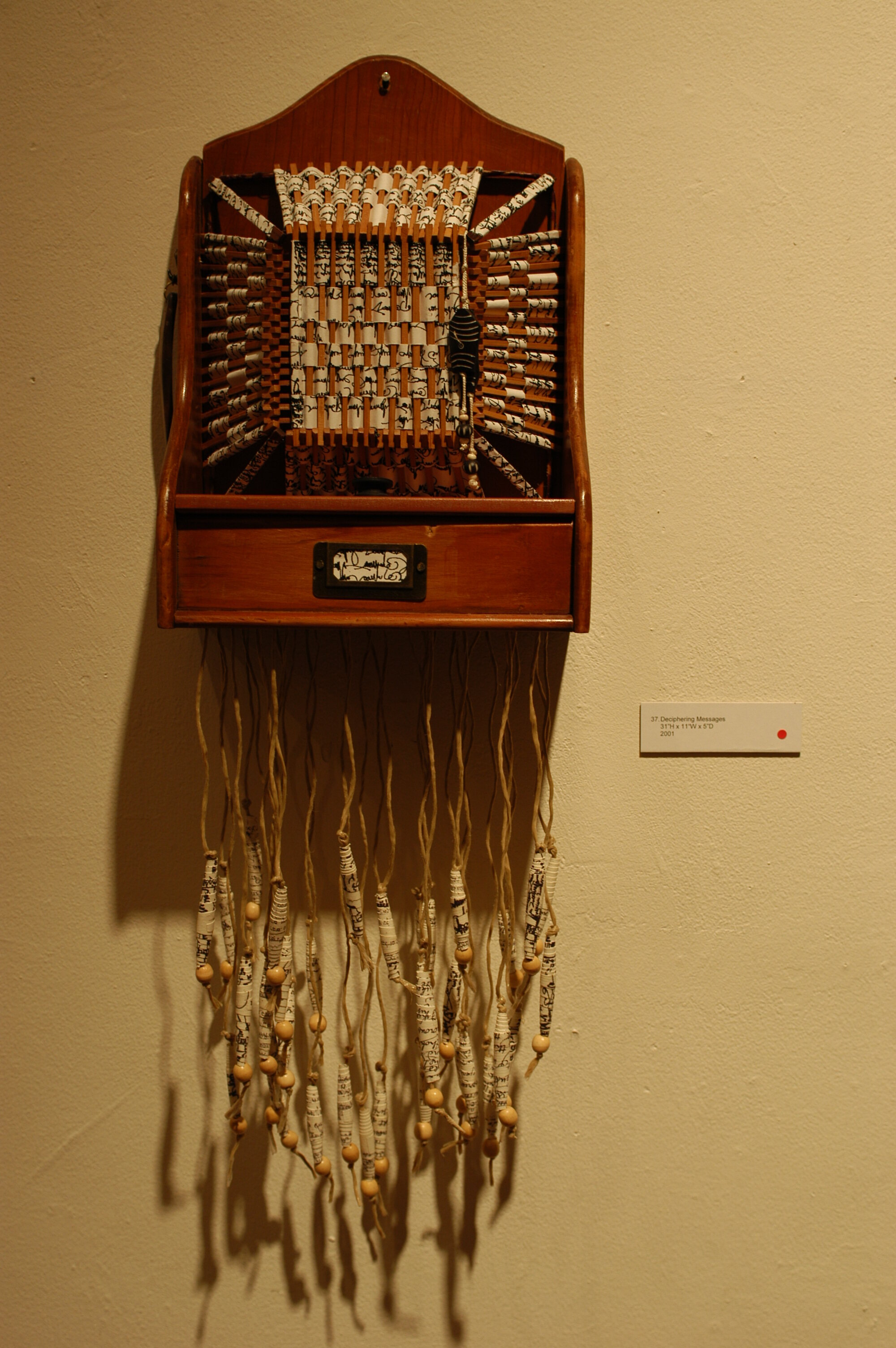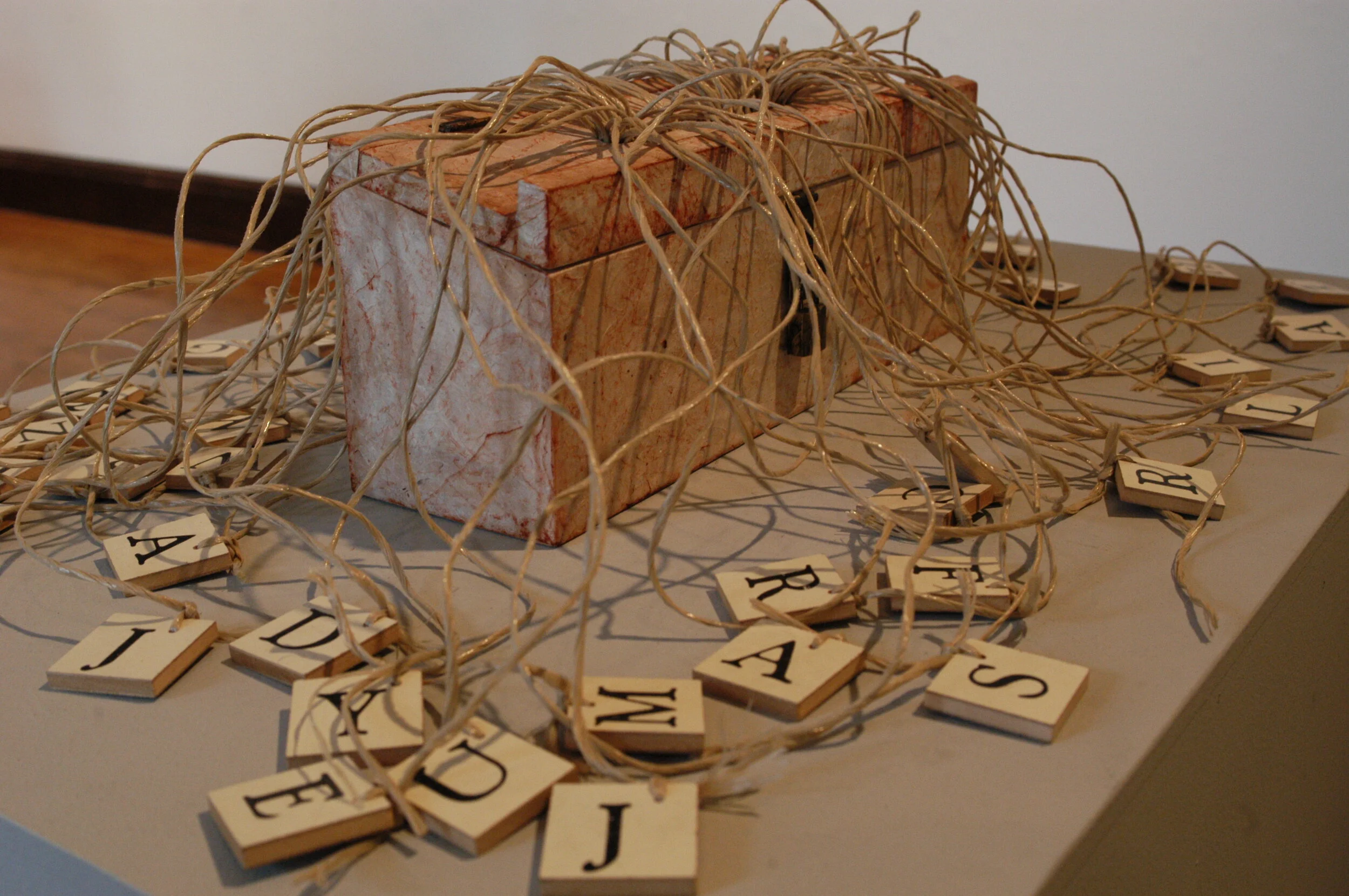 Viviana Lombrozo exhibited in the Main Gallery and Rotunda her assemblages that observe, catalogue and examine her own personal recollections, allowing the connection of past, present and future. Her assemblages included a combination of found objects (mostly family heirlooms and trinkets) with her own artwork; they consisted of wall sculptures, self-standing sculptures and sculptures suspended from the ceiling. A block of ice was also suspended from the ceiling of the Main Gallery, gradually melting into a container on the floor below.