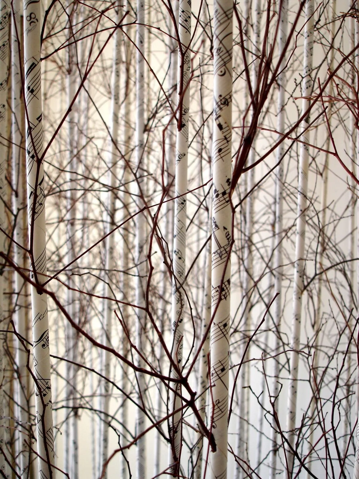 Local artist Elena Lomakin created an installation for the Rotunda Gallery depicting a forest of birth trees created from sheet music. She also displayed thirteen painting and collages.