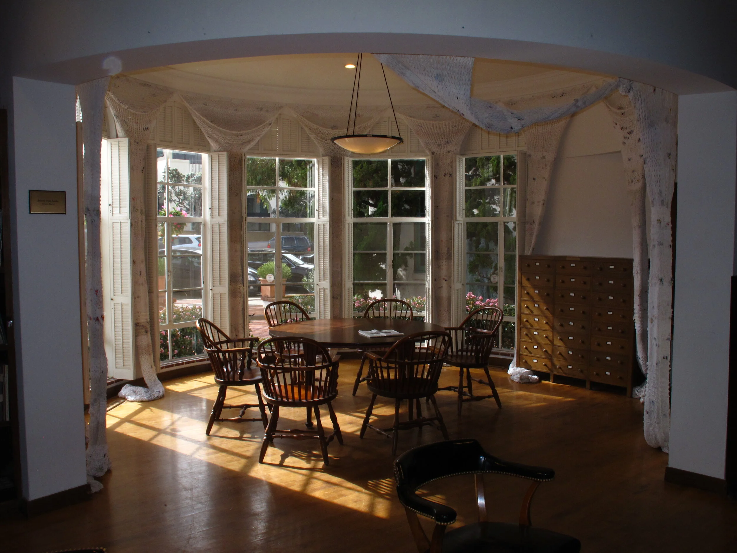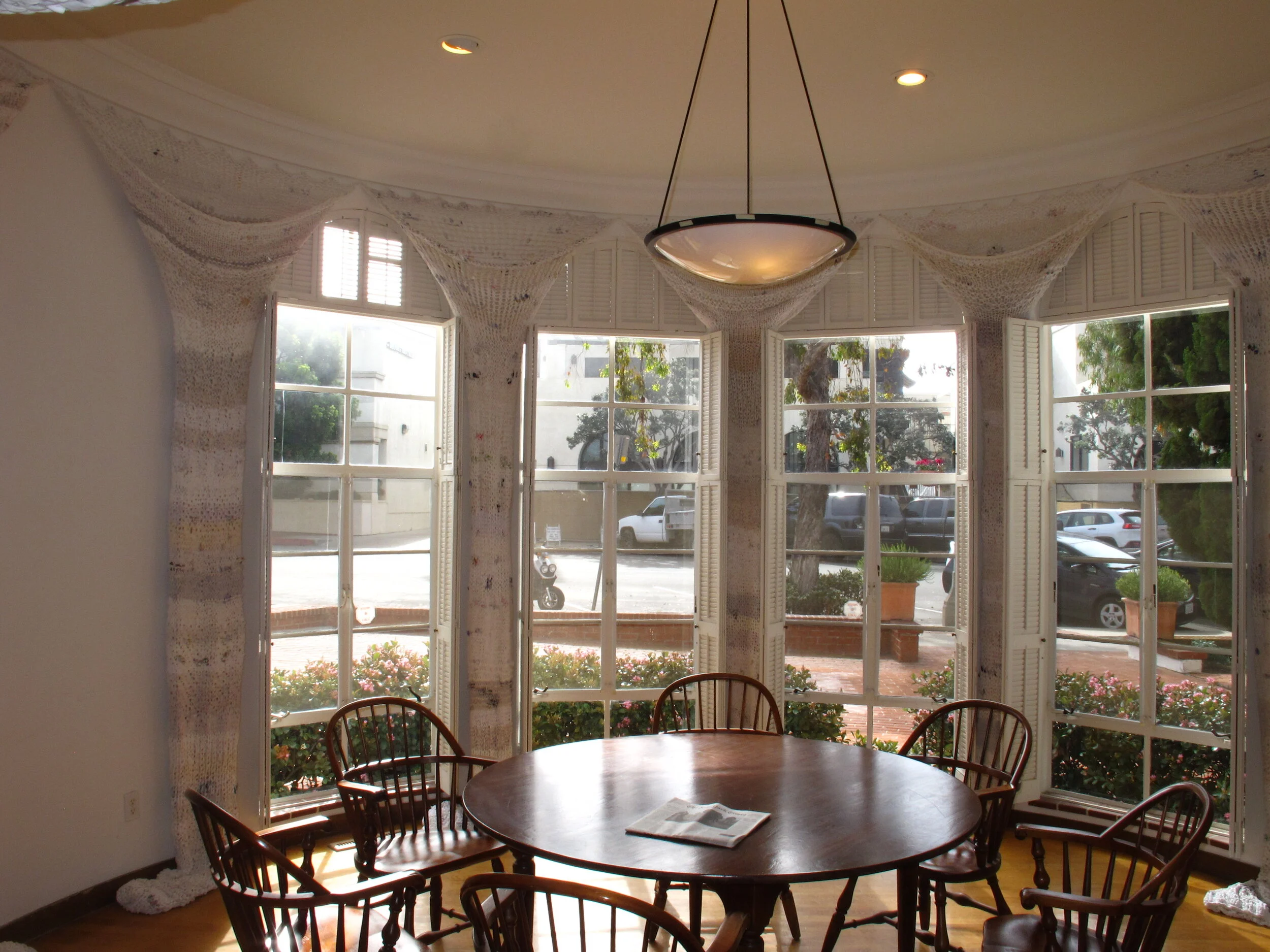 Over 500 t-shirts were collected by the artist, cut into strips, and knitted together into twelve-foot forms resembling sleeves. Montjoy is a widely-exhibited Southern California artist.