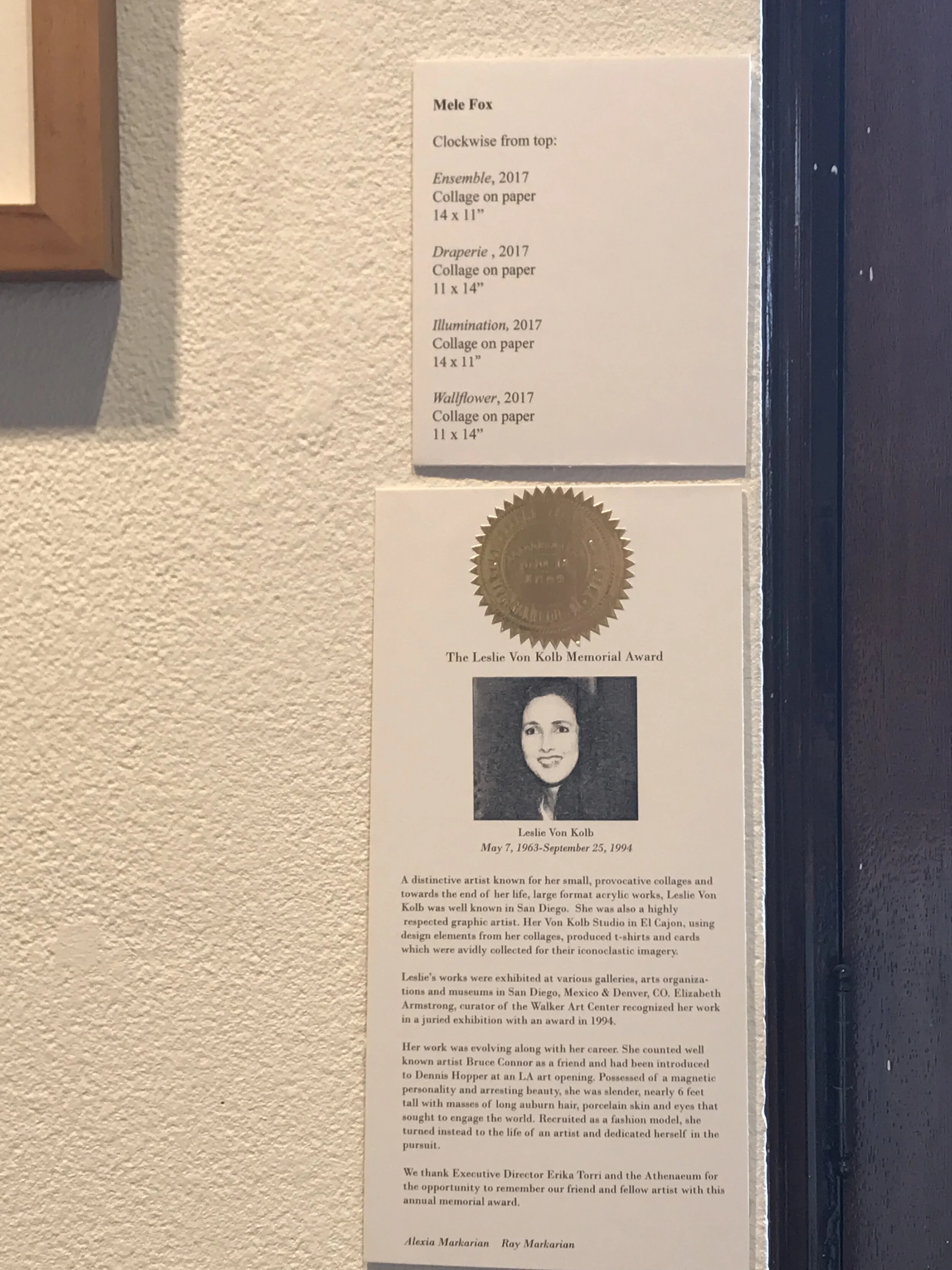 Jurors Alessandra Moctezuma, Gallery Director, Professor of Fine Art, San Diego Mesa College and Kara West, Library Arts and Culture Exhibition Manager, San Diego Public Library selected 40 San Diego-based artists to exhibit 55 works of art in this 26th consecutive year of the Athenaeum’s Annual Juried Exhibition. Artists: Elisa Amour, Kristina Bell DiTullo, Judith Christensen, Nora Cohen, Bijan Dowlatshahi, Christine Foerster, Mele Fox, Kirsten Francis, Scott Gengelbach, Jenessa Goodman, Ivy Guild, Becky Guttin, Therese Cipiti Herron, James Kendall Higgins, Kris Hodson Moore, Wayne Hulgin, Lisa Hutton, Beliz Iristay, Margaret Larlham, Elena Lomakin, Chris Martino, Michael McAlister, Arie Menes, Lori Mitchell, Andrew Najera, Tatiana Ortiz-Rubio, Philip Petrie, Jenna Refuerzo, Vincent Robles, Sibyl Rubottom, Julia San Román, Gail Schneider, Cheryl Sorg, Elizabeth Stringer, Meredith Sward, David Russell Talbott, Jennifer Vargas, Alejandro Arreguin Villegas, Vicki Walsh, Melissa Walter, John Thomas Wood.