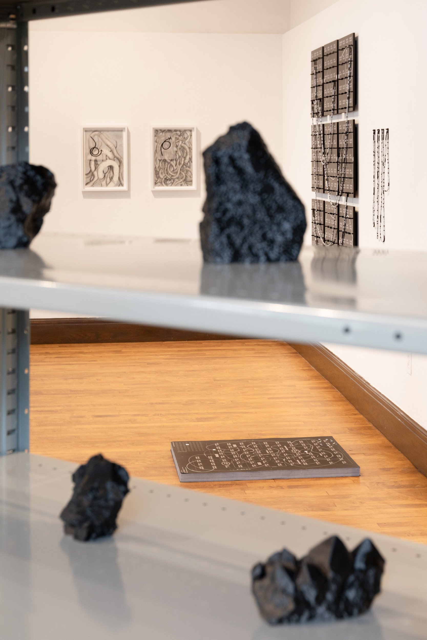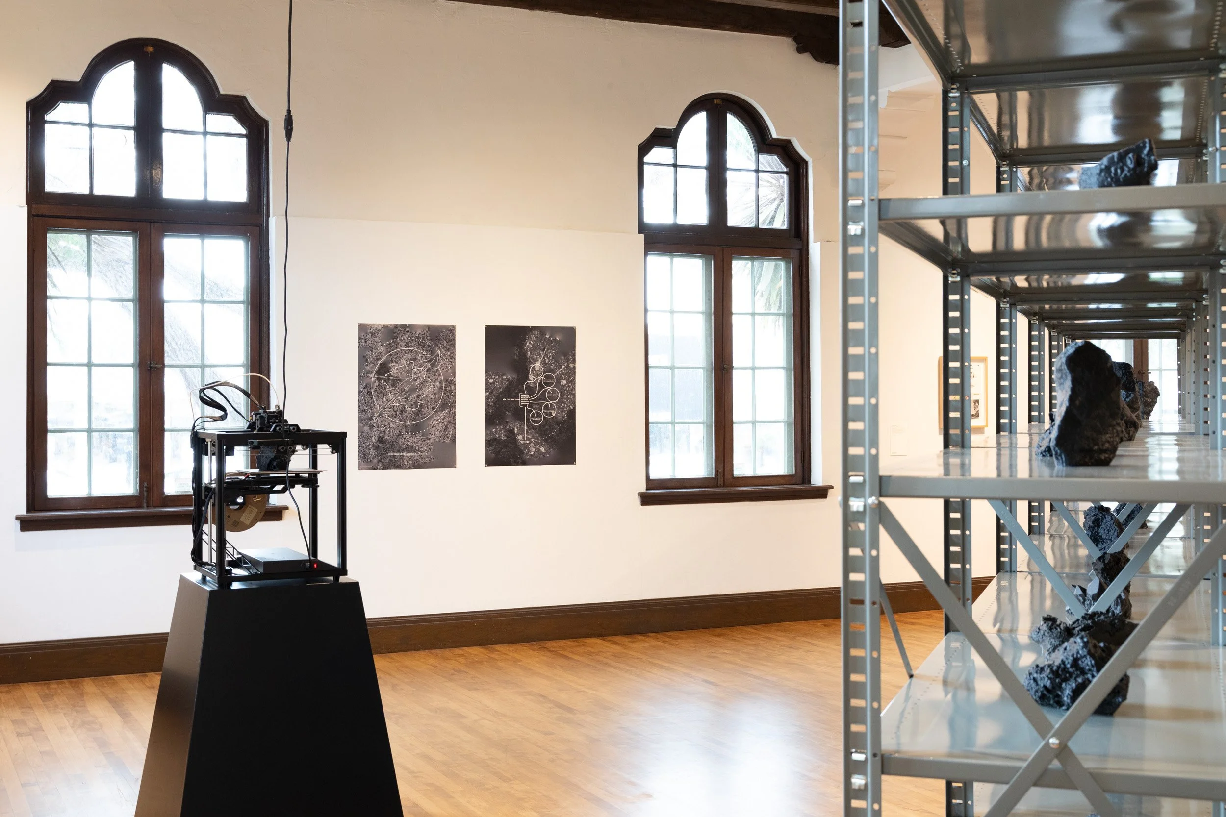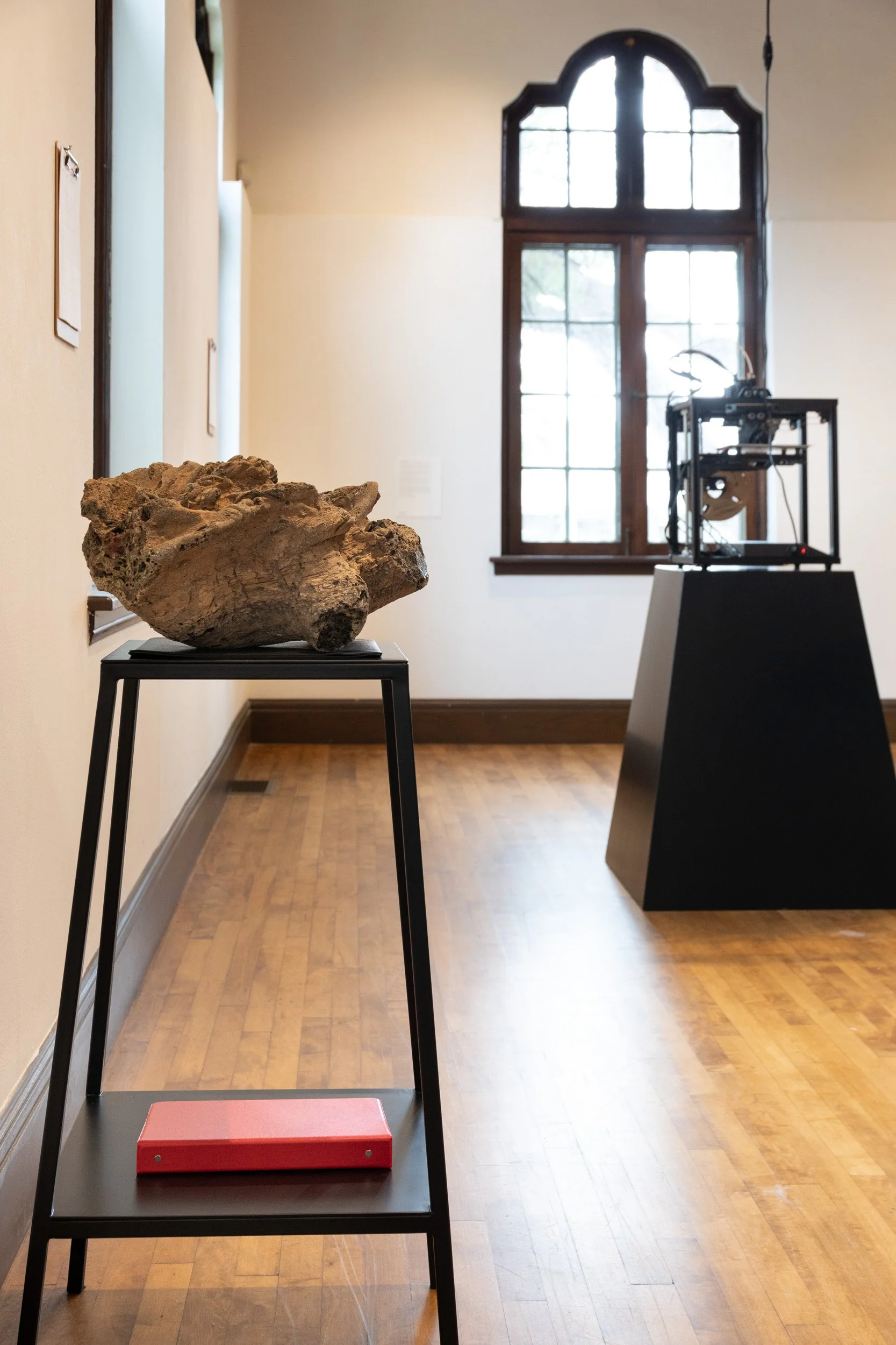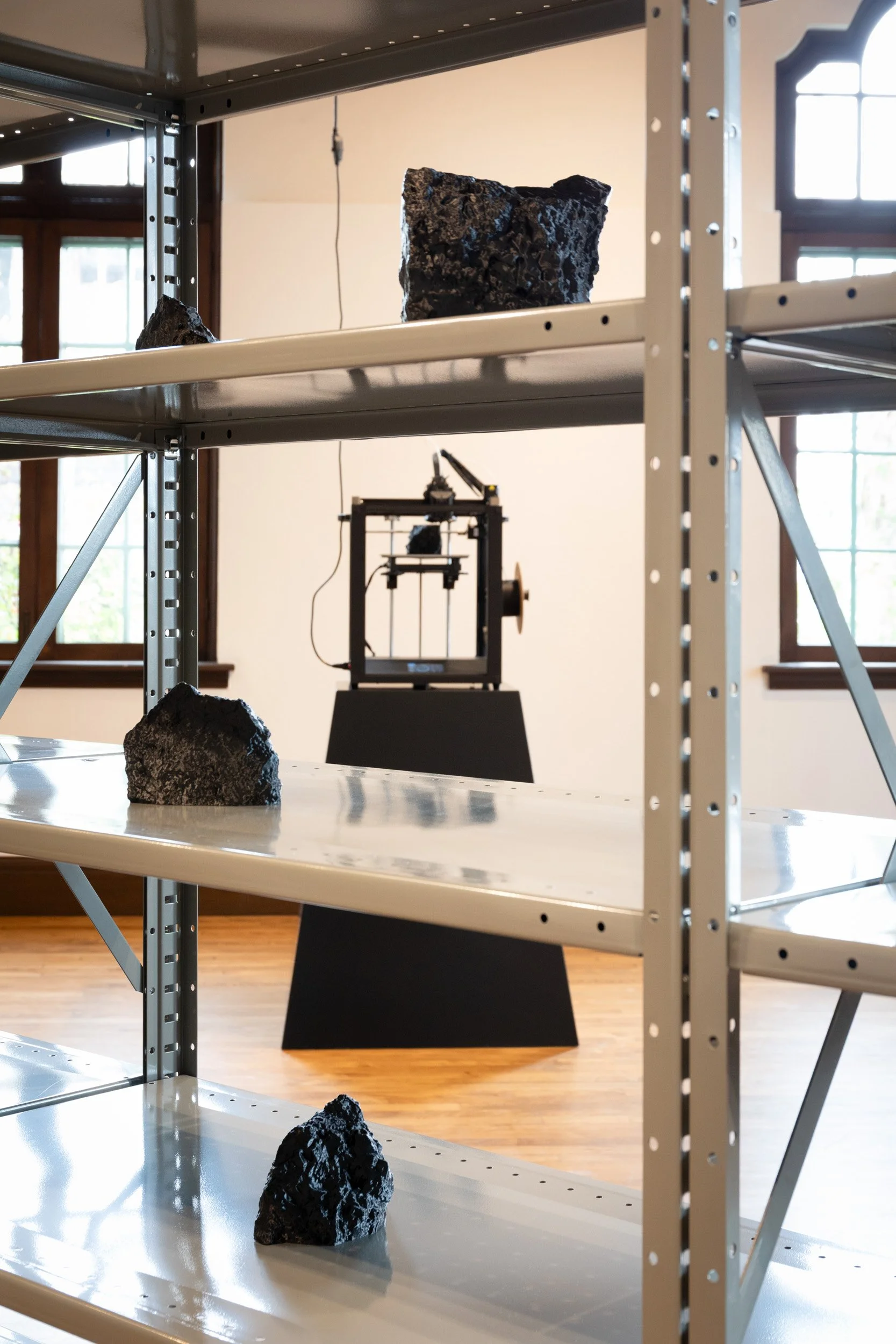 Isivivane is a Zulu word which translates to a "pile of stones,” similar to a cairn, which marks a spiritually or historically significant site. Isivivane also means to make an individual contribution to a collective future. Manufactured daily by a 3D-printer on site, the new rocks become part of what the artist calls a Black Earth Library. This is an effort that has arisen from discussions with geologists and geology museum curators concerning restitution and repatriation of culturally significant objects. In asking the host institution to create digital and physical copies of more or less significant rocks, stones, and other small geological objects, Dennis suggests a geo-social system not built by a single person, but by many over time. Isivivane will be accompanied by related sculptures and drawings, and displays of rocks and minerals selected by the artist from local collections.