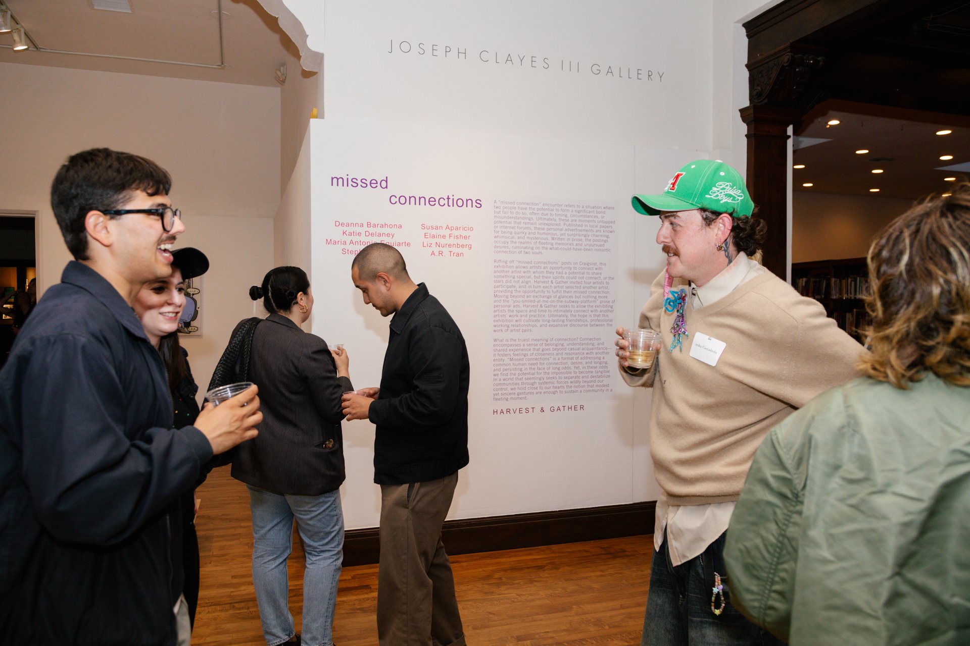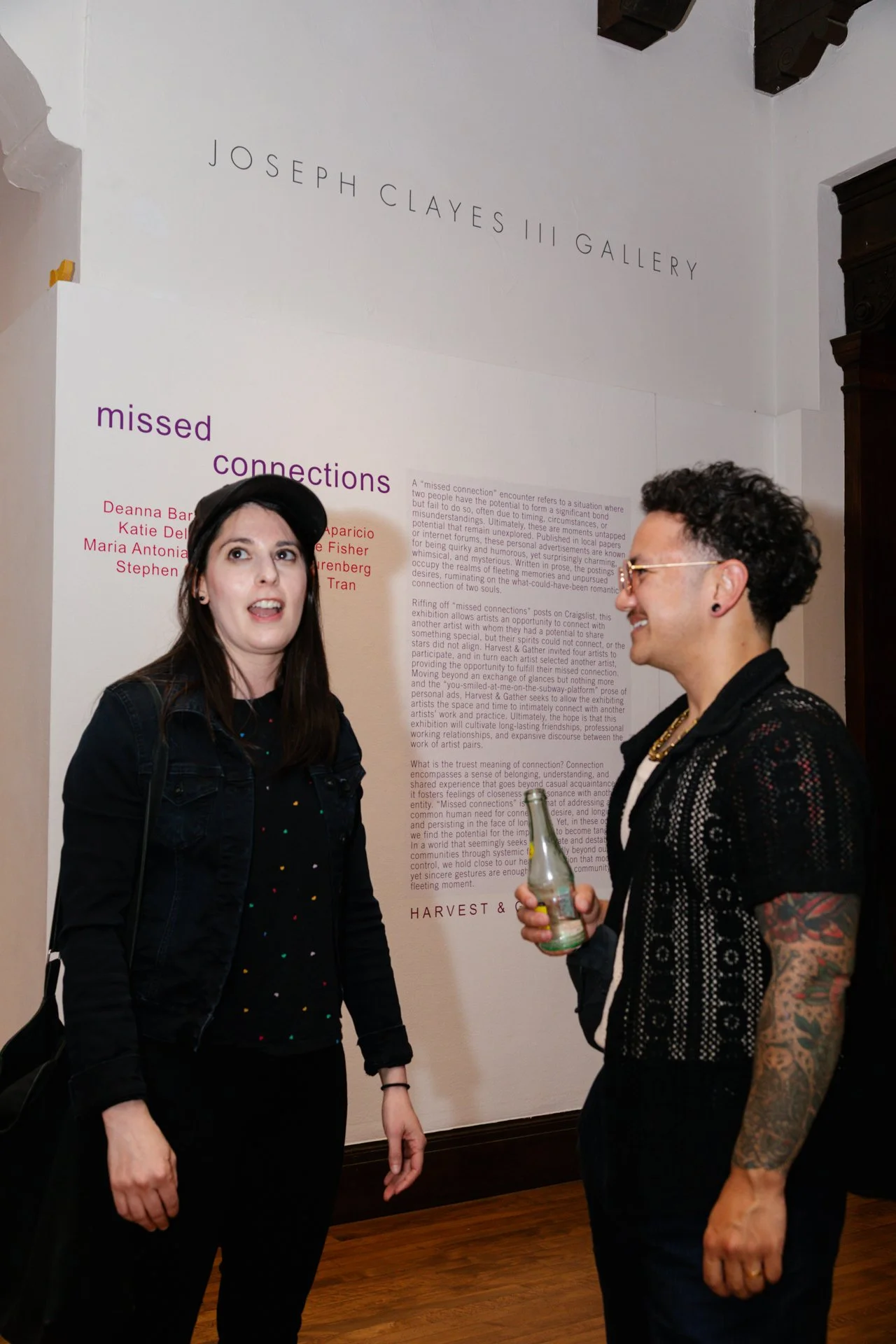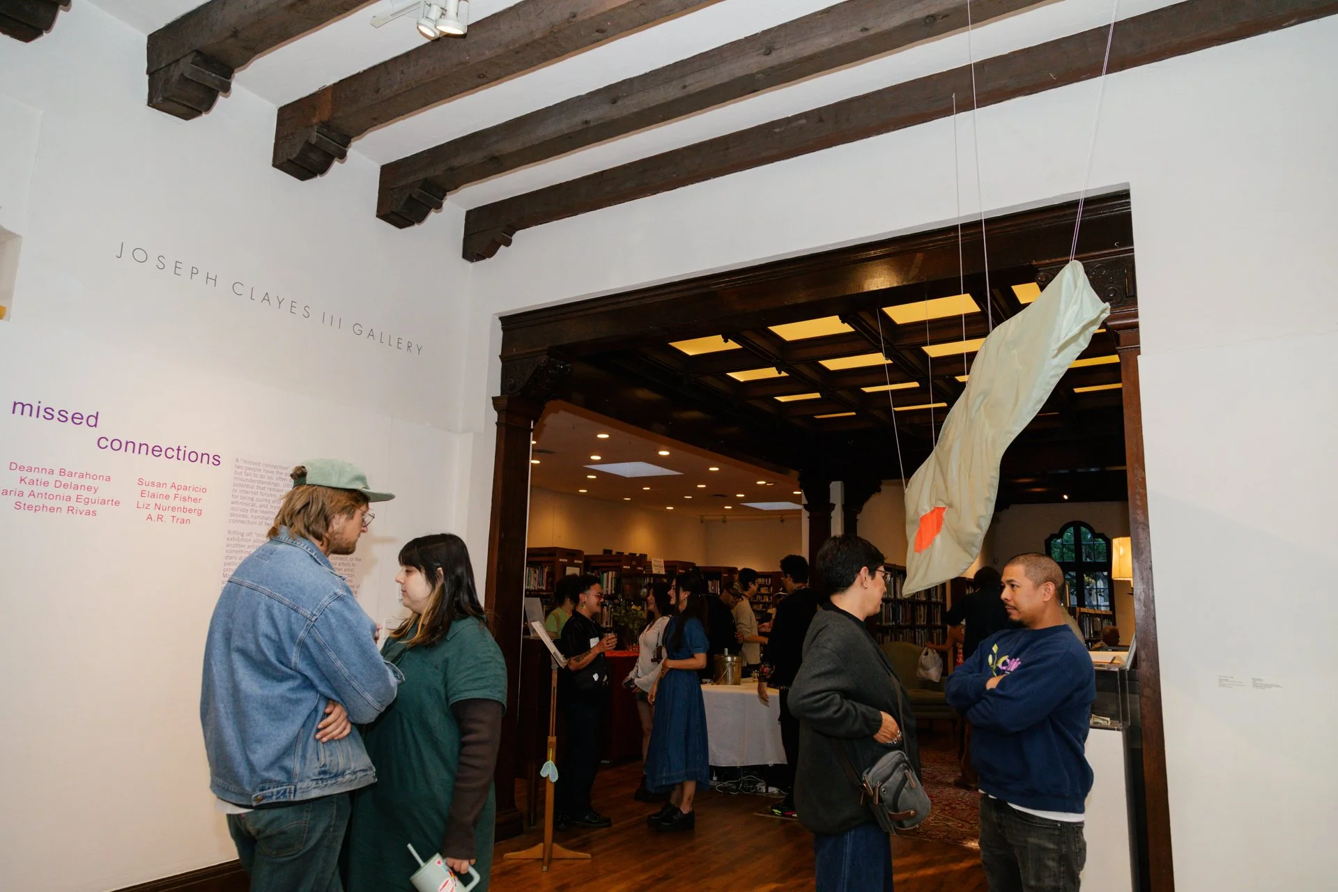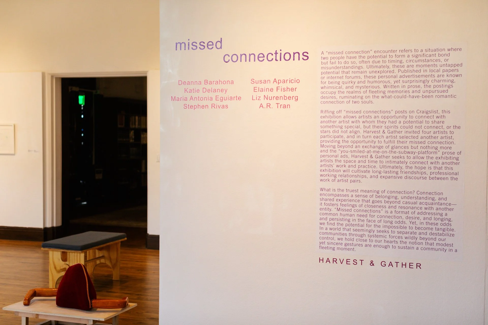 Harvest & Gather is pleased to present missed connections, an exhibition that facilitates collaboration between artists who might have once worked together, but the stars did not align in their favor or their spirits could not quite connect. Each invited artist has selected another artist to exhibit with, thus fulfilling their missed connection at the Athenaeum. Moving beyond an exchange of glances but nothing more and the “you-smiled-at-me-on-the-subway-platform” prose of personal ads, Harvest & Gather seeks to allow the exhibiting artists a working opportunity to intimately connect with another artist’s work and practice. Artists are Deanna Barahona and Susan Aparicio; Katie Delaney and Elaine Fisher; Maria Antonia Eguiarte and Liz Nurenberg; and Stephen Rivas and A.R. Tran.