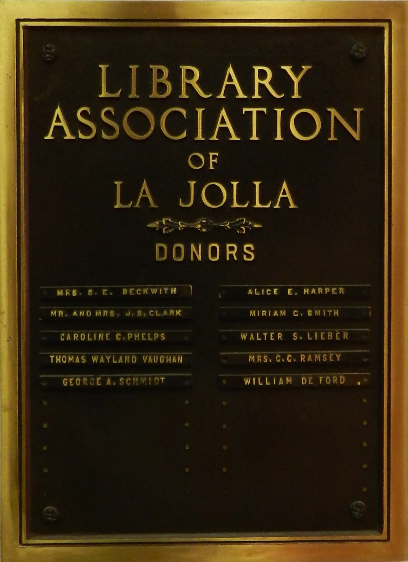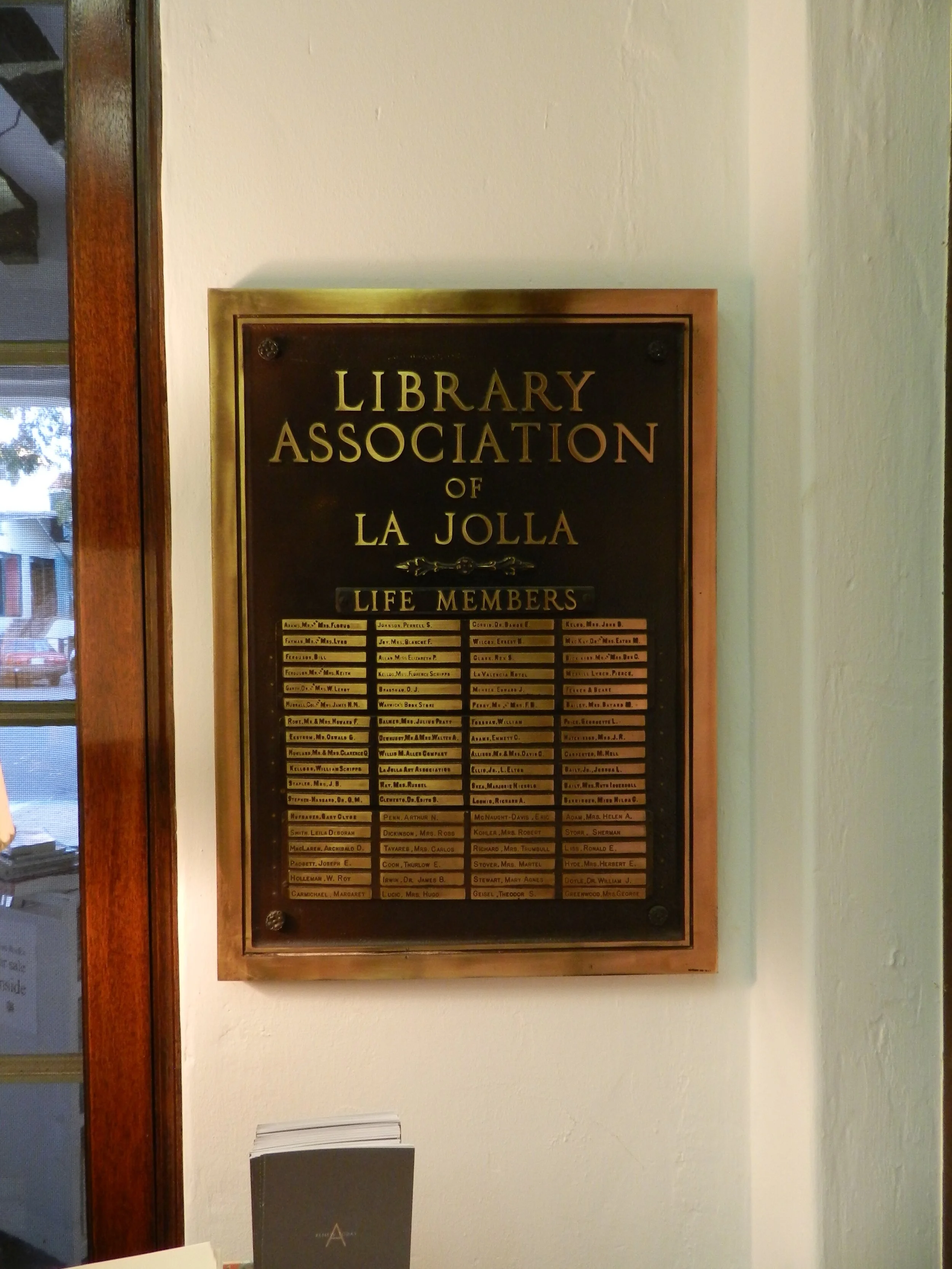 Four bronze tablets, unveiled on New Year’s Day 1930, commemorate the library’s founders, patrons, donors, and life members, whose names were added through the years. These plaques still grace the walls of the main lobby area. The life member’s plaque is perhaps the most interesting one, underscoring the importance of tradition in the Athenaeum “family.” In addition to individuals, several local businesses, such as Warwick’s, La Valencia Hotel, the La Jolla Art Association, and Las Patronas had become life members, fostering the spirit of community. One name on the plaque, though very famous, may not be readily recognized, since most bibliophiles know Theodor S. Geisel as the revered children’s book author Dr. Seuss.